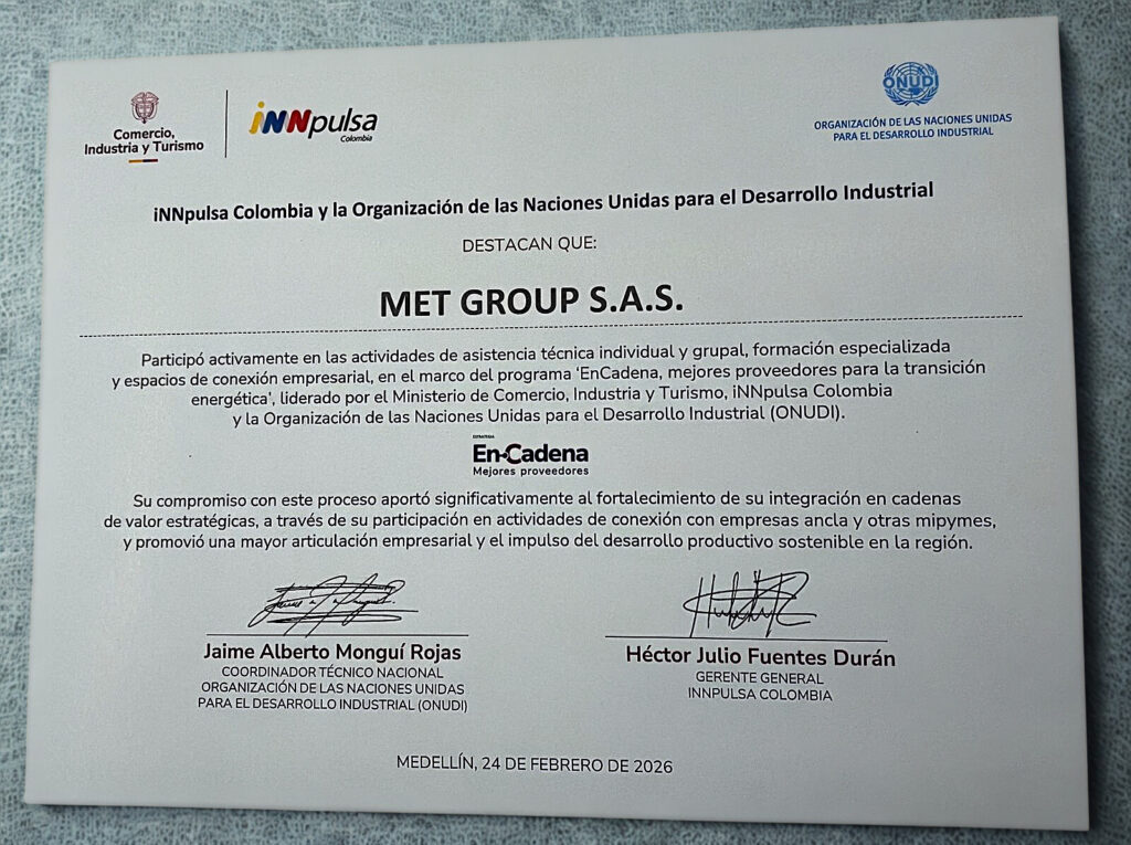 MET GROUP S.A.S. fue reconocida por iNNpulsa Colombia y la Organización de las Naciones Unidas para el Desarrollo Industrial (ONUDI) por su participación activa en el programa “EnCadena, mejores proveedores para la transición energética”, una iniciativa orientada al fortalecimiento empresarial y al desarrollo productivo sostenible. El reconocimiento destaca el compromiso de MET en las actividades […]